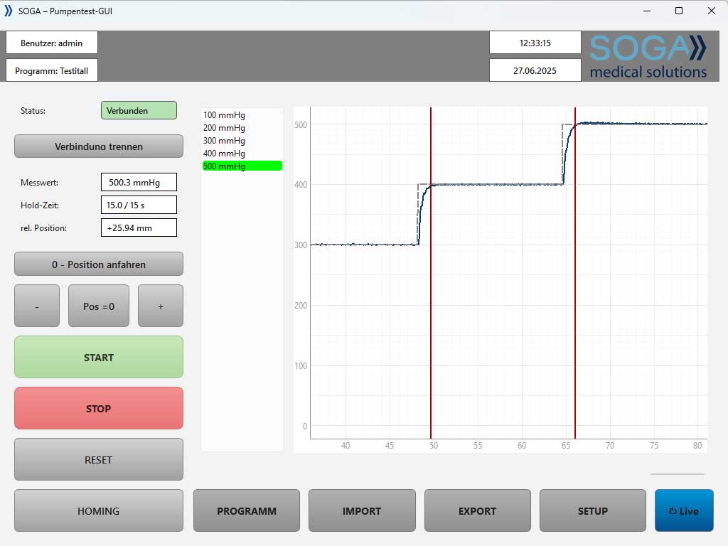 Unser Prüfplatz ermöglicht die programmierbare, stufenweise Belastung bis zu 800 mm Hg. Prüfstufen, Haltezeiten und Druckprofile lassen sich frei definieren – für standardisierte Prüfsequenzen oder kundenspezifische Protokolle.